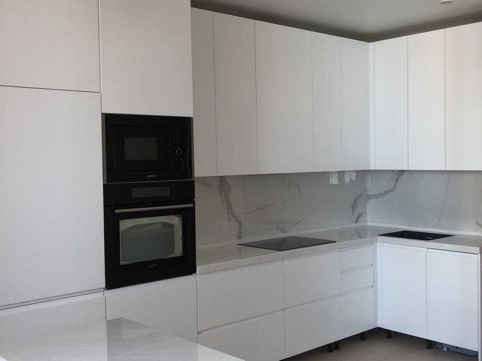 Белая кухня с интегрированными ручками