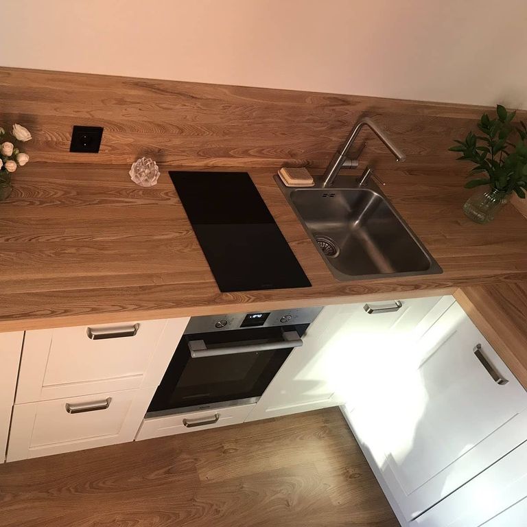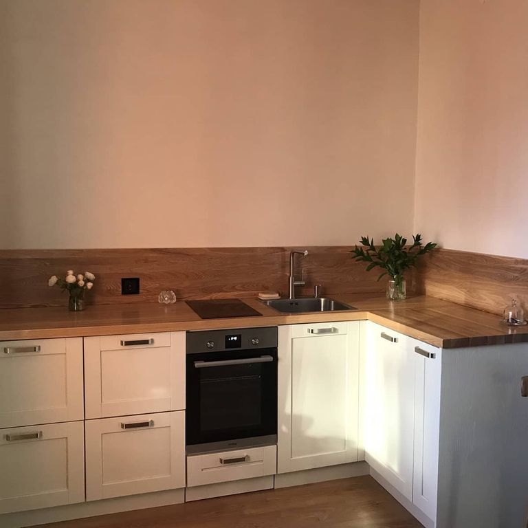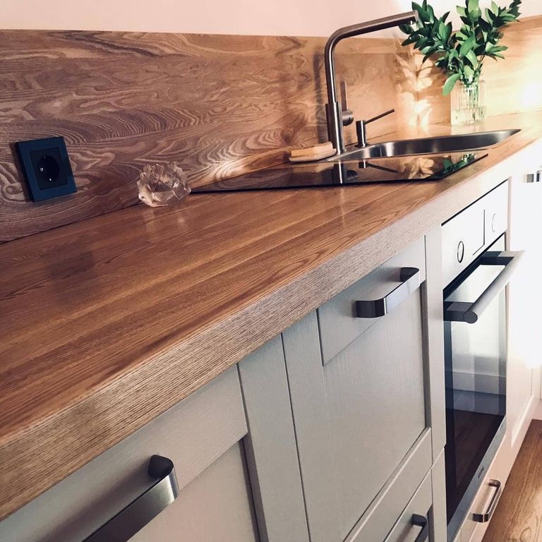 Кухонный гарнитур с деревянными фасадами, столешницей и фартуком