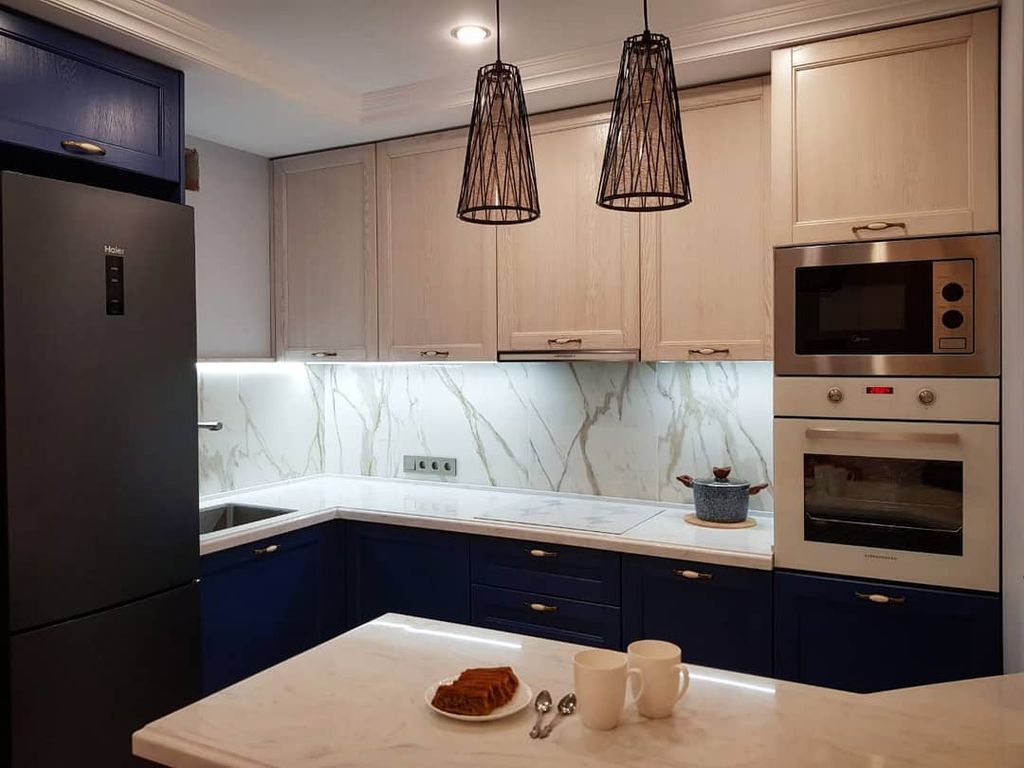 Кухонный гарнитур с фасадами из ясеня и столешницей из акрилового камня